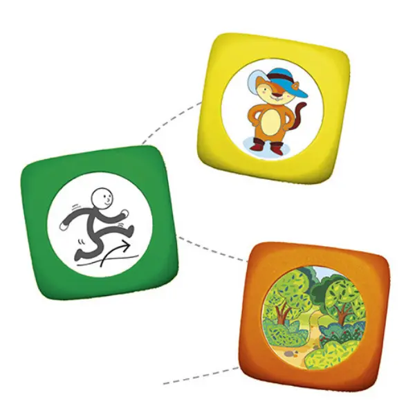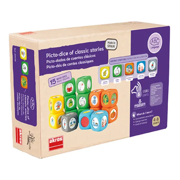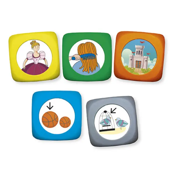 Jogo para trabalhar a construção de frases com o apoio de dados com pictogramas de personagens de contos clássicos. Contém 15 dados com 90 pictogramas diferentes que correspondem a distintos elementos estruturais da oração: 12 sujeitos (personagens dos contos), 36 verbos (ações), 24 substantivos (elementos familiares à criança), 12 adjetivos e 6 advérbios.