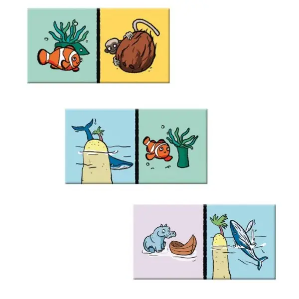 Idade: dos 3 aos 6 anos | Nº de jogadores: 2 a 4 | Conteúdo: 36 dominós coloridos em formato 5,2 x 10,4 cm. Ilustrações: 10 animais em que cada imagem é representada em três posições diferentes em relação a um mesmo objeto. Manual.