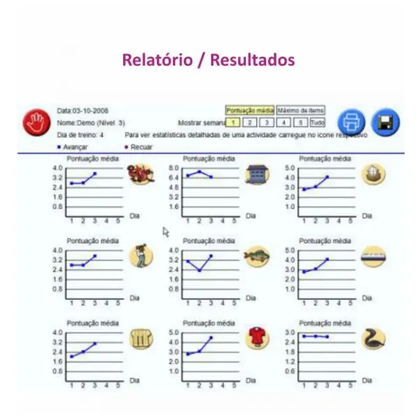 Os Relatórios com os resultados podem ser guardados no disco ou impressos. Pode ver a pontuação média ou o máximo de itens conseguido; pode obter os resultados semanais e totais.