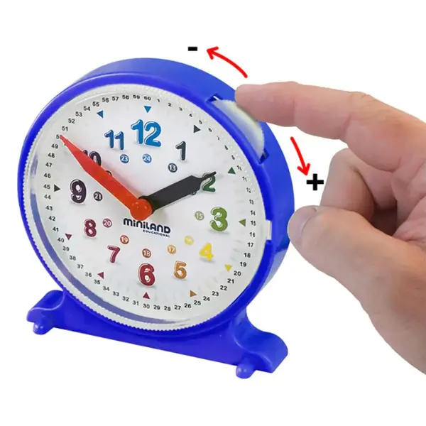 De dimensões adequadas e fabricado em plástico resistente, possui uma roda lateral que permite o manuseio autónomo pela criança. O mostrador é dividido em horas e minutos com números claros e cores diferentes. É acompanhado por 12 fichas em torno das atividades diárias da criança, para ler as horas de maneira analógica e digital.