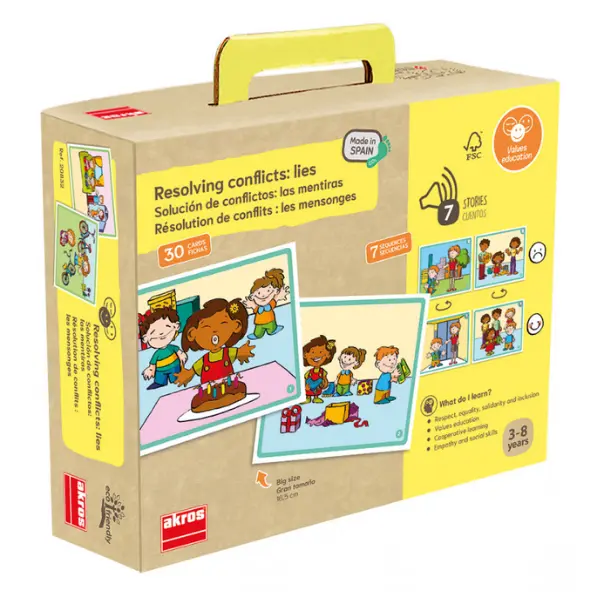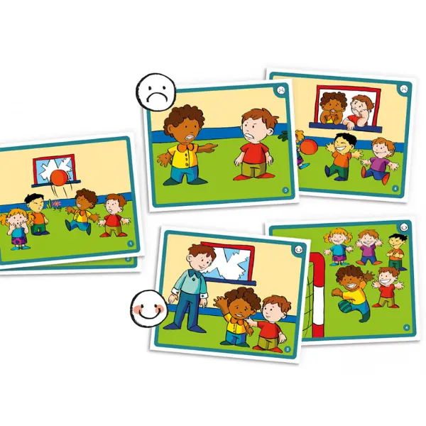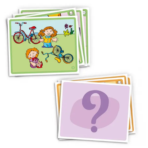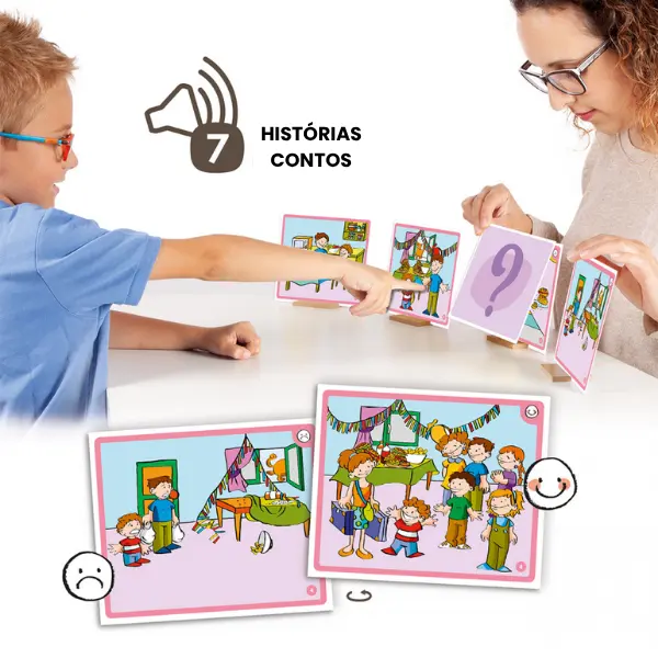 Conteúdo: 7 histórias ilustradas com diferentes finais, em 30 cartões de grande formato (16,5×13,5 cm) com sistema autocorretivo no verso; 4 Suportes para cartões | Ficheiros para download incluem: 7 Histórias; Guia didático e Instruções; Texto das histórias; Fichas para colorir.