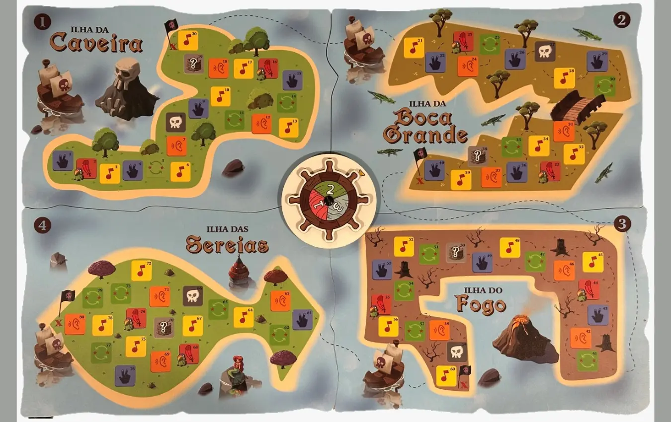 - Uma roleta (leme) com os números de 1 a 3, indicando a progressão no tabuleiro;