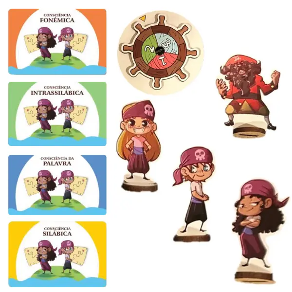 - 4 tabuleiros em madeira, com casas coloridas. Cada casa tem uma cor e esta corresponde a uma dimensão da consciência fonológica;