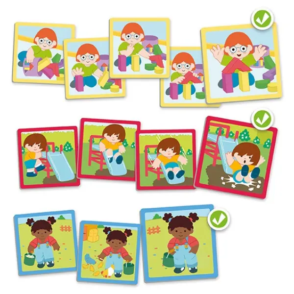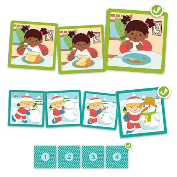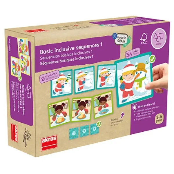 Pequenas histórias com sequências cujo objetivo principal é iniciar nas crianças a perceção cronológica. A realização ordenada das histórias ajuda a conhecer o «antes e o depois», contribuindo para um sentido temporal nas diferentes etapas e duração de um modo coordenado e rítmico. Contém um sistema autocorretor para uma ordenação cronológica adequada. Devido à simplicidade das imagens, estas sequências são ideias para trabalhar com crianças mais pequenas ou em educação especial.
