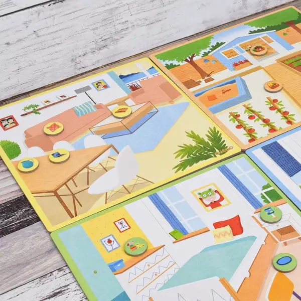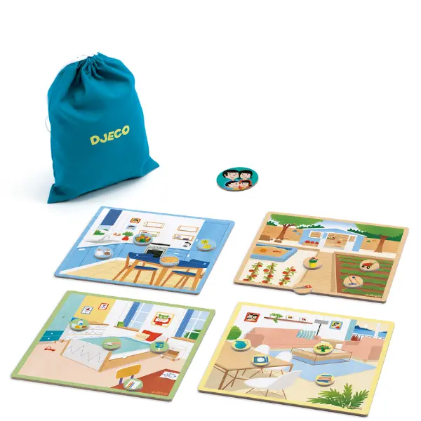 Idade: dos 5 aos 99 anos | Conteúdo: 4 tabuleiros (cozinha, sala, quarto e jardim); 36 fichas de objeto (9 por tabuleiro); 1 peça de família e 1 saco em algodão | Nº de Jogadores: 2 a 4.