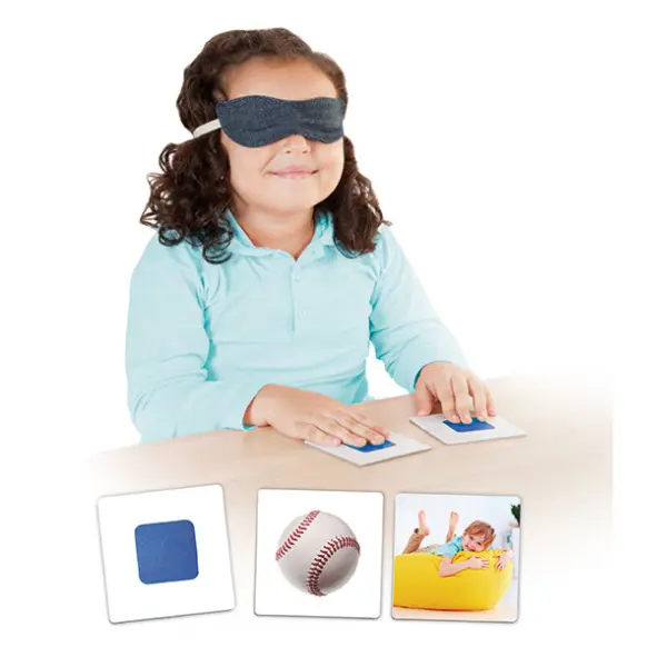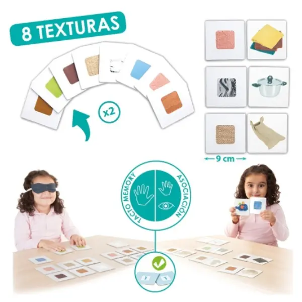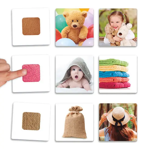 Este jogo contém 16 fichas com fotografias para serem associadas às fichas de tato com materiais reais, que apresentam a mesma textura. Para facilitar a associação correta entre as fichas de tato e as fichas fotográficas, as peças possuem um sistema autocorretor no verso. São abordadas as seguintes texturas: couro/pele; madeira; pelúcia; alumínio; serapilheira; plástico; turco; lixa.