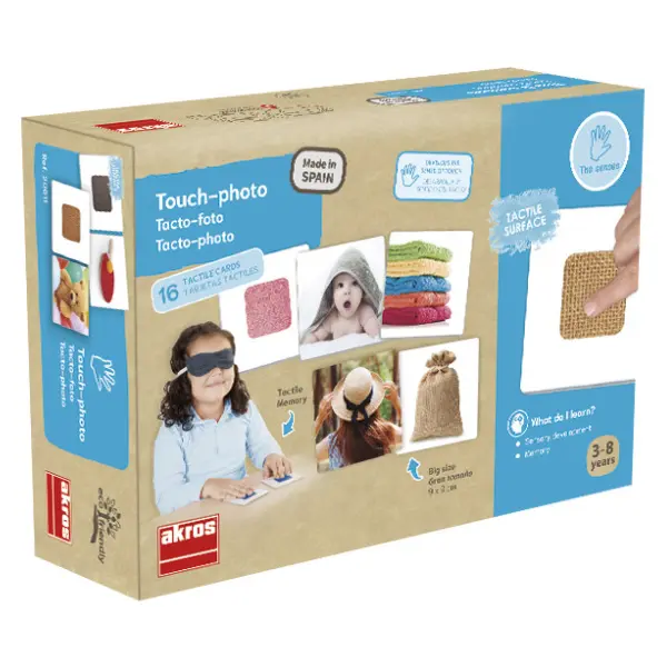 Conteúdo: 16 fichas táteis, 9×9 cm; 16 fichas fotográficas de objetos; 2 vendas; folha de autocolantes com a numeração de 1 a 8 em duplicado; instruções; mala.