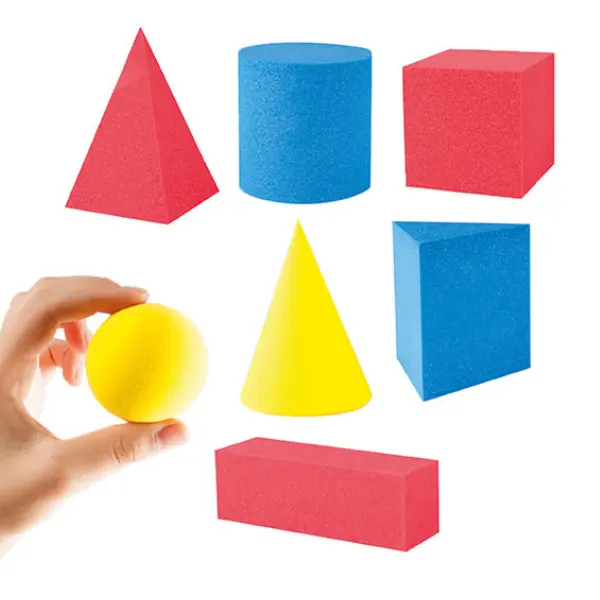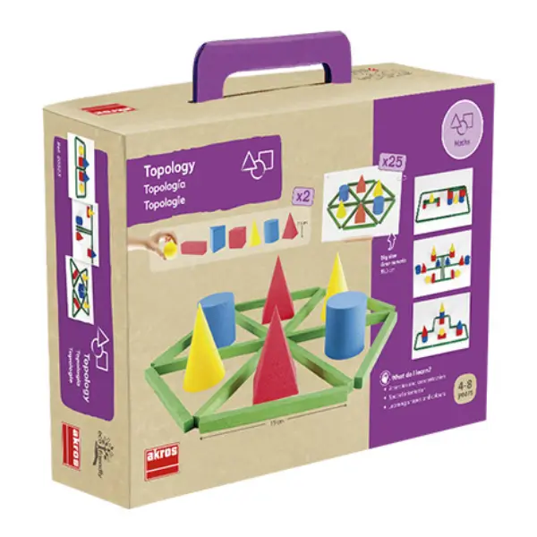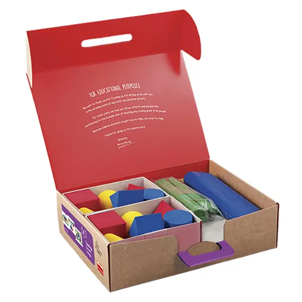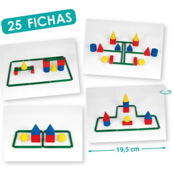 Conteúdo: 14 formas geométricas sólidas (2 conjuntos de 7 sólidos); 15 barras; 50 fotografias modelo; 2 sacos opacos (para trabalhar o tato); Mala para arrumação do jogo; Instruções incluindo sugestões de atividades.