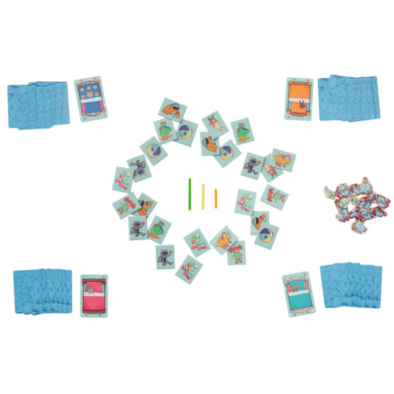 Coloca os brinquedos, sê o primeiro. Começa com um forte “Depressa!” Os jogadores enchem suas caixas de brinquedos com as peças de brinquedo correspondentes o mais rápido possível. Se não forem rápidos o suficiente, terão que pegar as peças do caos e escondê-las debaixo da cama. Quem acumular menos “lixo” debaixo da cama ganha o jogo.