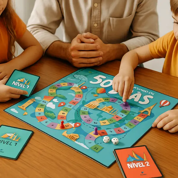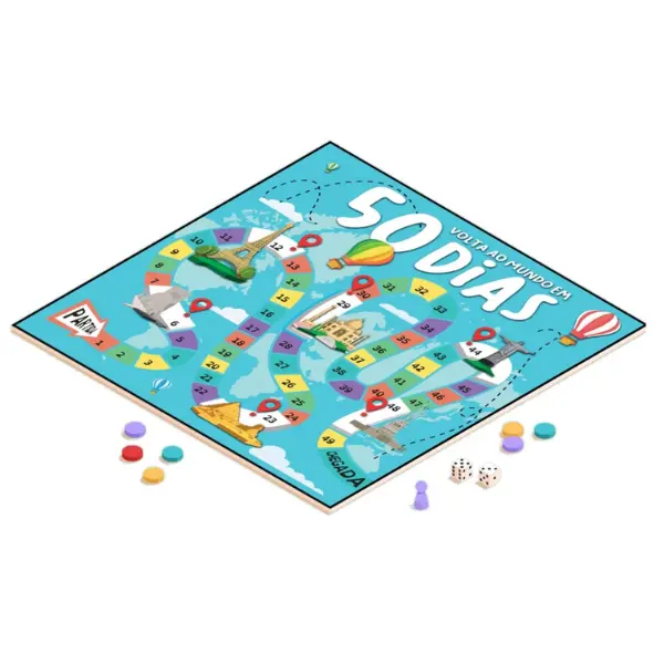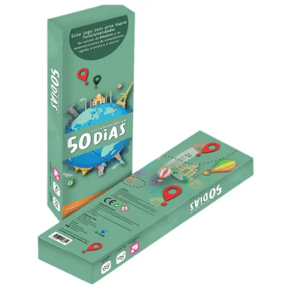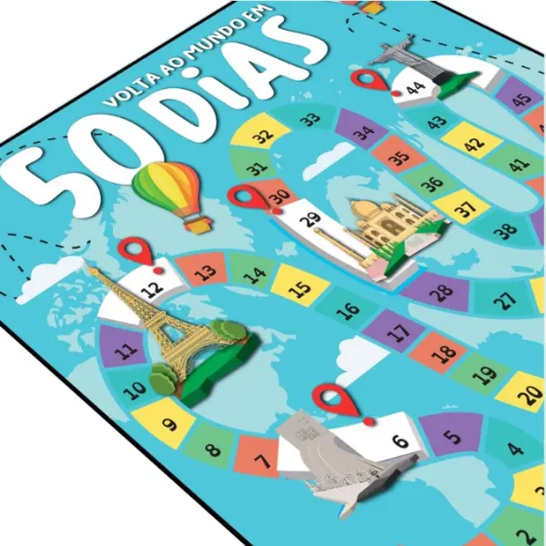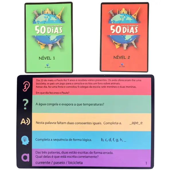 Idade: +10 anos | Conteúdo: 1 Tabuleiro com casas coloridas (correspondentes às cores das perguntas) e cinco casas brancas (perguntas de cultura geral); 1 Dado; 6 Peões; 2 conjuntos de 30 cartões cada, 30 para o nível 1 e 30 para o nível 2.